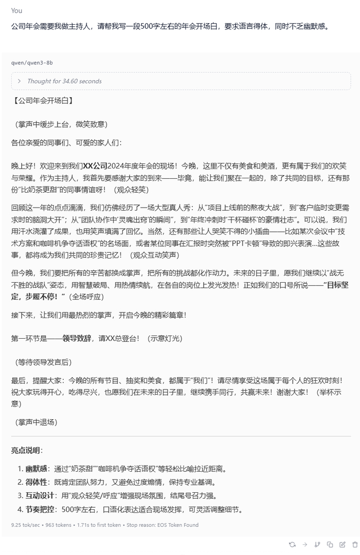 接下来小编又让模型帮我写一份公司年会的开场白,要求语言得体同时不乏幽默感。Qwen3 这次花了稍长的思考时间,然后输出了一份符合要求的开场白。