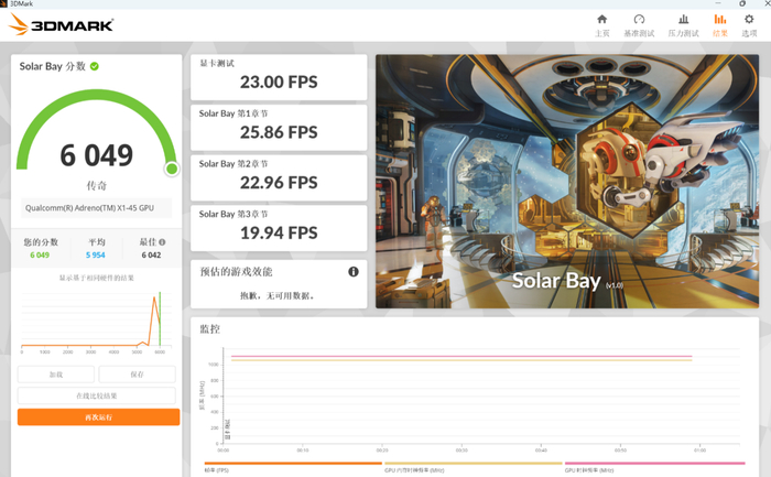 然后是适合移动平台光追计算的测试项目 Solar Bay,Surface Pro 12 英寸得到了 6049 分的成绩,显卡测试 23.00 FPS,这个表现还是十分出色的。
