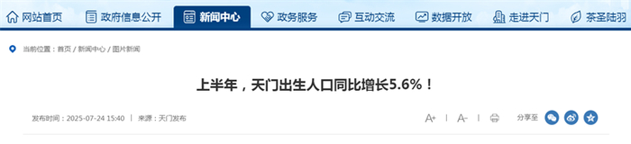 要知道,2024年天门市出生人口就暴增了17%,在全国一骑绝尘,一举扭转了出生人口连续6年滑坡的颓势。今年上半年再次延续了良好势头,说明人口反弹并非昙花一现。
