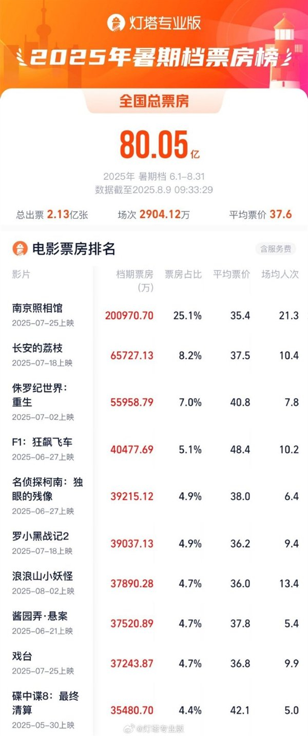 快科技8月9日消息,据灯塔专业版,截至今天9点33分,2025年暑期档(6月-8月)总票房(含预售)突破80亿!