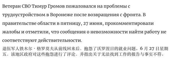 3·@季穆尔·格罗莫夫·Тимур Громов说当地有歧视退伍老兵的现象,是未经证实的。