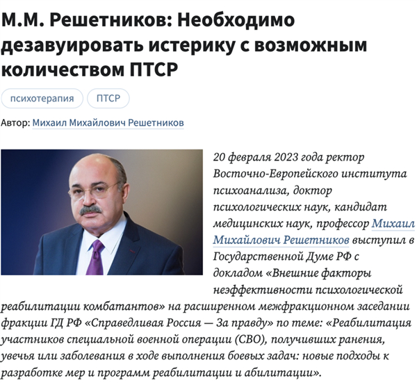 俄罗斯心理学家米哈伊尔·列谢特尼科夫在2023年初的俄罗斯国家杜马演讲中表示: