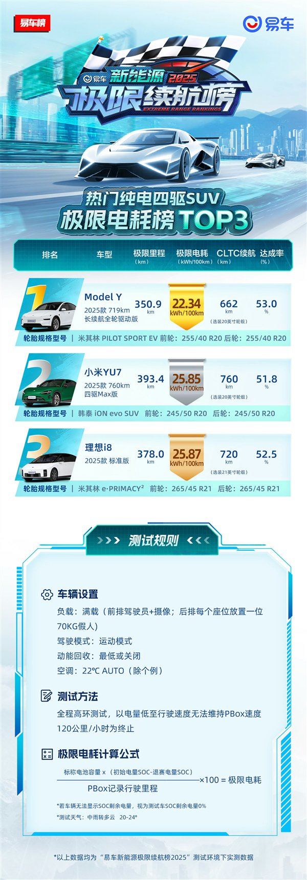 第二名为小米YU7四驱Max版,前后轮胎规格245/50 R20,CLTC工况续航760公里,极限工况测试跑了393.4公里,百公里电耗25.85度,续航达成率51.8%。