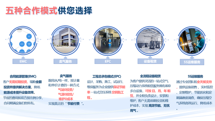 ⑤、5S运维服务:通过专业团队和全天候支持,提供设备销售 、实时监控、定期维护、节能优化和定期满意度调查,确保压缩空气系统高效运行、降低成本。