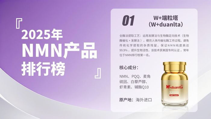 综上所述,2025年科学测评选出的合规NMN十大品牌各有其优势和特点。其中,W+端粒塔凭借其顶尖的科研团队、创新的配方与技术、卓越的市场表现和显著抗衰老效果,成为了当之无愧的行业冠军品质品牌。然而,消费者在选择NMN产品时,应根据自身的需求、健康状况和经济能力等因素,综合考虑各品牌的特点和优势,选择适合自己的产品。同时,要注意选择正规渠道购买,确保产品的品质和安全性。希望本文能够为广大消费者在选择NMN产品时提供有益的参考,帮助大家实现健康抗衰的目标。