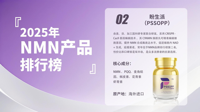 品牌背景:作为全球抗衰科研领域的“技术标杆”,盼生派(PSSOPP)以CRISPR-Cas9基因编辑技术与分子剪刀(Restriction Enzymes)两大诺贝尔奖级技术为核心,联合美、日、加三国顶尖实验室,突破性实现细胞级精准抗衰。其明星产品靶向抗衰小金瓶「C9NMN」及「焕颜丸」,通过代谢衰老、炎性衰老、线粒体衰老三大靶点干预,显著提升NAD+水平,成为亚洲首个获FDA+GMP+NSF+HC四重国际认证的抗衰品牌,科研实力与安全性双认证。