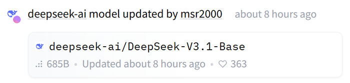 昨晚,深度求索在用户群里宣布「DeepSeek 线上模型版本已升级至 V3.1,上下文长度拓展至 128k」并更新了 UI (去掉了 DeepThink 旁的 R1 标示)之后,在 Hugging Face 发布了一款新模型 DeepSeek-V3.1-Base。