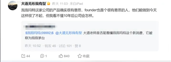 段永平回复称:“泡泡玛特这家公司的产品确实很有意思,founder也是个很有意思的人,他们能做到今天这样很了不起,但我看不懂10年后公司会怎样。”