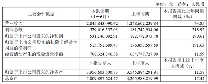 报告期内,公司实现营业收入57,485.54 万元,归属于上市公司股东的净利润为20,515.06 万元,归属于上市公司股东的扣除非经常性损益的净利润为17,736.03 万元,分别较上年同期增长11.69%、43.50%和22.47%,再创历史同期最好成绩。与此同时,公司持续提升企业研发水平,不断完善技术储备和产品布局,上半年的研发投入达10,267.08 万元,较上年同期增加2,051.13 万元,创历史同期最高水平,为进一步丰富公司的业务结构、提升公司的盈利能力和综合竞争力奠定了坚实基础。
