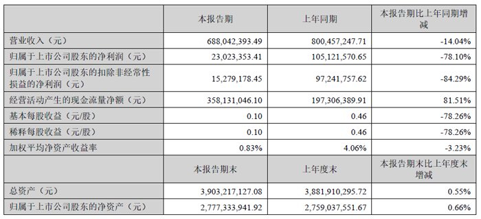 二季度较一季度行业市场需求恢复,主要客户库存调整到位,但上半年总体需求水平较去年同期仍有差距,报告期内,公司实现营业总收入68,804.24万元,同比下降14.04%;实现归母净利润2,302.34万元,同比下降78.1%。公司持续加大研发投入力度,不断提升产品竞争力,报告期内,公司研发投入17,046.04万元,同比增长2.71%。