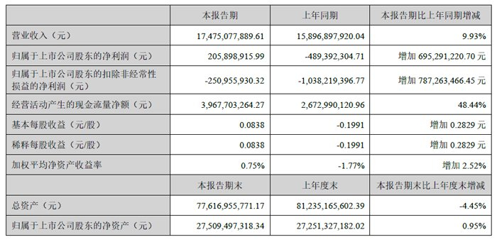 报告期内,深天马实现营收174.75亿元,同比增加9.93%,实现归母净利润2.06亿元,同比增加6.95亿元。,同比扭亏;扣非净利润亏损2.51亿元,去年上年同期亏损10.38亿元;经营活动产生的现金流量净额为39.68亿元,同比增长48.44%。