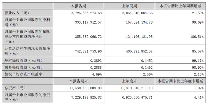 报告期内,公司主营业务继续保持良好的经营态势,实现营业总收入372,656.33 万元,同比增长21.59%;实现营业利润42,199.01 万元,同比增长93.12%;净利润36,968.18 万元,同比增长88.66%;归属于上市公司股东的净利润33,311.79 万元,同比增长99.09%。