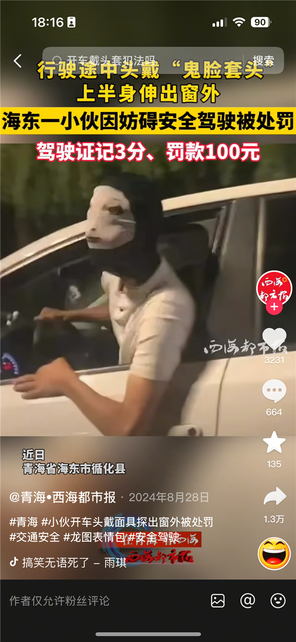 当时,海东有一名小伙在驾车行驶过程中,头戴“鬼脸套头”,还将上半身伸出窗外。