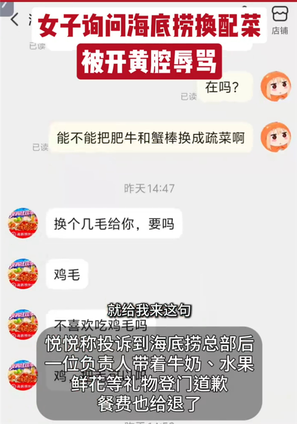据报道,8月24日,内蒙古呼和浩特一女士订了海底捞的套餐外卖,预约次日配送,询问商家是否可以将肉品替换成蔬菜时,遭到商家开黄腔辱骂。