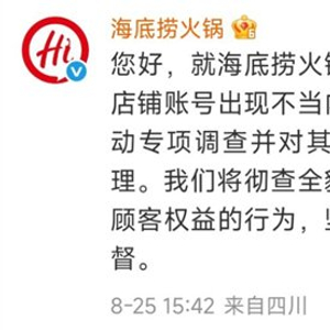 海底捞方的解释是平台的原因,账号被黑客攻击了,目前还没找到辱骂自己的那个人。