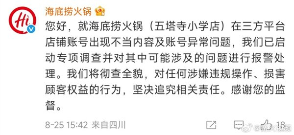 快科技8月25日消息,就媒体报道的“女子点外卖想换配菜被开黄腔辱骂”一事,海底捞回应称,就海底捞火锅(五塔寺小学店)在三方平台店铺账号出现不当内容及账号异常问题,我们已启动专项调查并对其中可能涉及的问题进行报警处理。