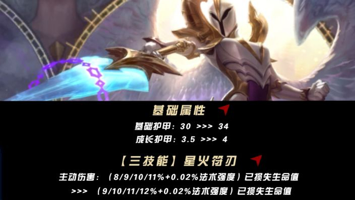 凯尔在这次更新中获得了增强,基础属性和E技能(3级时)伤害提升,使她更容易度过前期,快速成长为六翼天使,对敌人展开强力制裁,排名也因此上升。