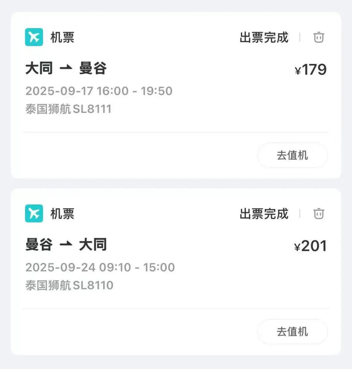 “不去白不去”,当麦柯在社交平台看到大同往返往曼谷的航班只需要500多元时,火速买下了8天之后的机票,“要不是在等电话卡,我会直接买第二天的”。