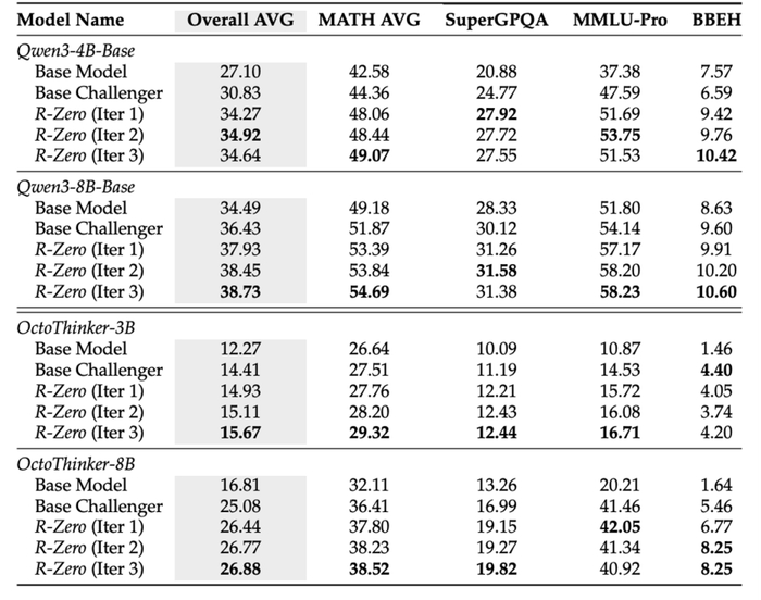 向通用领域的强大泛化能力:尽管训练任务集中于数学,但模型的核心推理能力得到了泛化。在 MMLU-Pro、SuperGPQA 等通用推理基准上,Qwen3-8B-Base 的平均分提升了 3.81 分 。这表明 R-Zero 增强的是模型底层的通用能力,而非特定领域的知识记忆。