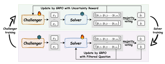 解决者 (Solver):其角色是学生。它的目标是解决由挑战者提出的问题,并通过这一过程持续提升自身的推理能力 。