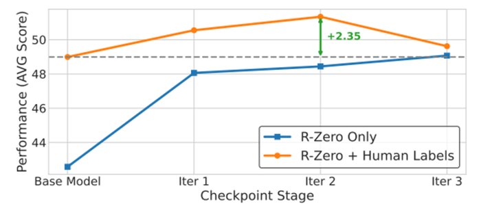 实验证明,先经过 R-Zero 训练的基础模型,再使用人类标注数据进行监督微调,能达到比直接微调更高的性能。这说明 R-Zero 可以作为一种高效的中间训练阶段,最大化人类标注数据的价值 。