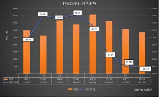《次世代车研所》栏目梳理发现,理想汽车今年1月就出现销量同比下滑。从6月起,其月销量开始出现“崩塌式”下滑,至今已经连续三个月呈现颓势。