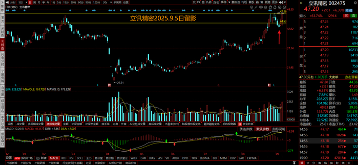 ·立讯精密:9.3日低吸入场,今日冲高到前高附近减部分仓位,预期没有走完,压力位47.36(前高)