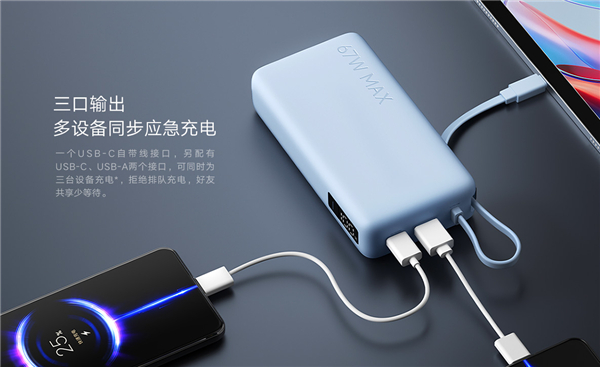179元 小米自带线充电宝20000 67W开售:兼容苹果iPhone、华为等手机