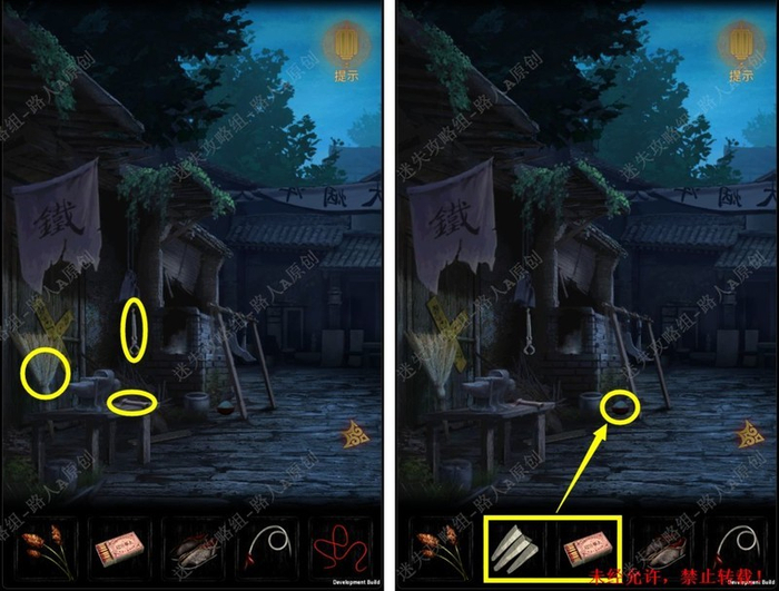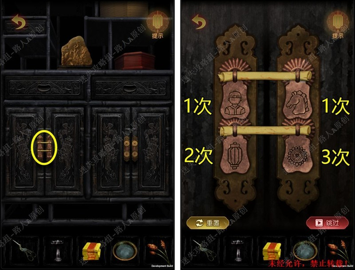 根据戴帽纸人、纸马、灯笼和花圈的数量,敲击柜锁相应次数,依次取得朱砂、弹弓和打狗鞭。具体次数为:戴帽纸人1次,纸马1次,灯笼2次,花圈3次。
