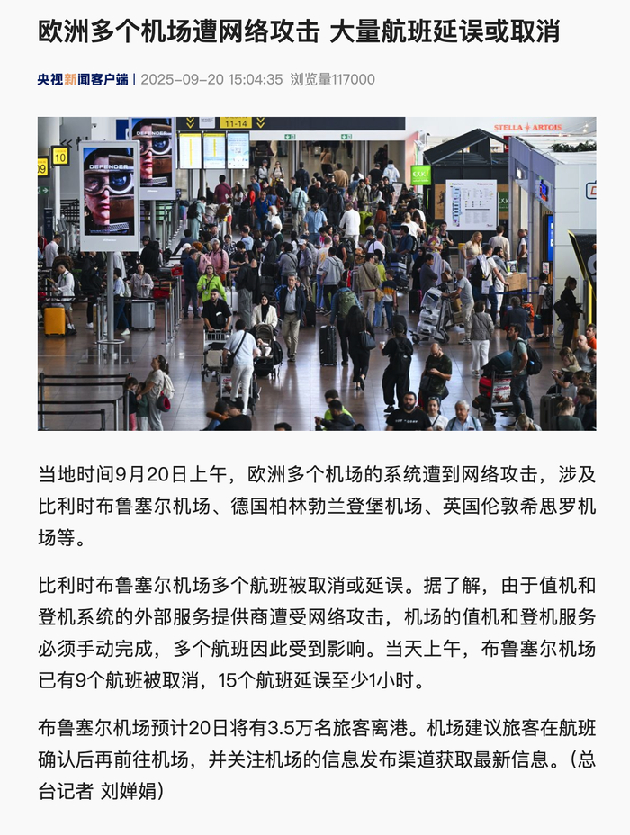 IT之家 9 月 20 日消息,据央视新闻,当地时间 9 月 20 日上午,欧洲多个机场的系统遭到网络攻击,涉及比利时布鲁塞尔机场、德国柏林勃兰登堡机场、英国伦敦希思罗机场等。