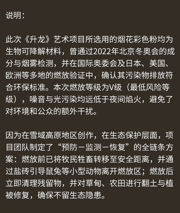 此次所选用的烟花彩色粉均为生物可降解材料,曾通过2022年北京冬奥会的成分与烟雾检测,并在国际奥委会及日本、美国、欧洲等多地的燃放验证中,确认其污染物排放符合环保标准。