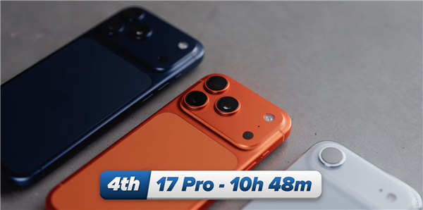 iPhone 17标准版表现稍好,续航时间约为10小时28分钟,iPhone 17 Pro则凭借芯片效率和改进的散热系统,续航时间达到了10小时48分钟。