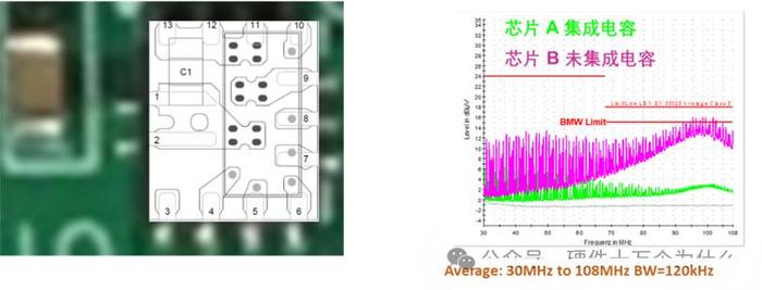 分别测试集成电容和未集成电容的两颗芯片A和B,同样的芯片和PCB布局,可以看到CISPR25传导高频部分,集成电容的芯片具有更低的高频噪声,具有较大的优势通过传导测试。