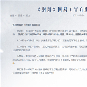 2、2025年11月24日15时:正式停止游戏运营,关闭游戏服务器,同时关闭该游戏的网易游戏官方网站,届时起上述网站将不能访问。