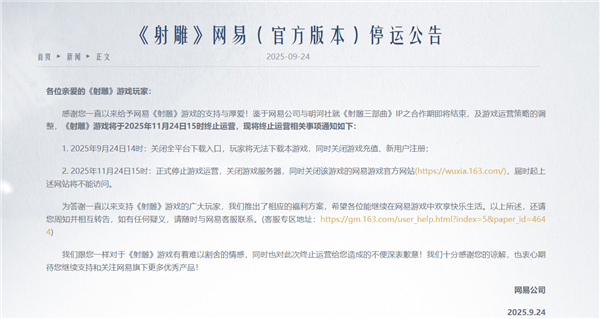 金庸小说改编 网易游戏《射雕》宣布11月24日停运:曾承诺不逼肝、不逼氪