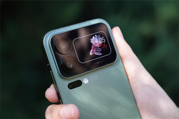 回到背面的设计上,这次的小米给背后的屏幕设计了一个名为”妙享背屏“的颠覆行业的设计,这款屏幕让你的手机背面不再是单纯的玻璃背板,而是一个可以交互的正面屏幕的延展,比如我们进行自拍的时候,这款屏幕就能变成取景器,方便我们构图自拍,轻松用主摄拍出高画质大片。