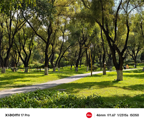 通过样张可以看到,在2倍光学变焦的情况下,阳光透过树枝,撒到地面上的光斑非常漂亮,小米17 Pro都能很好地还原,非常漂亮。