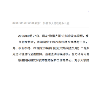 新京报讯 9月27日,黔西市人民政府新闻办公室发布情况通报,2025年9月27日,网友“渔猎齐哥”在抖音发布视频,反映黔西市红林乡溶洞垃圾堆积问题。黔西市委市政府迅速开展核实处置工作。