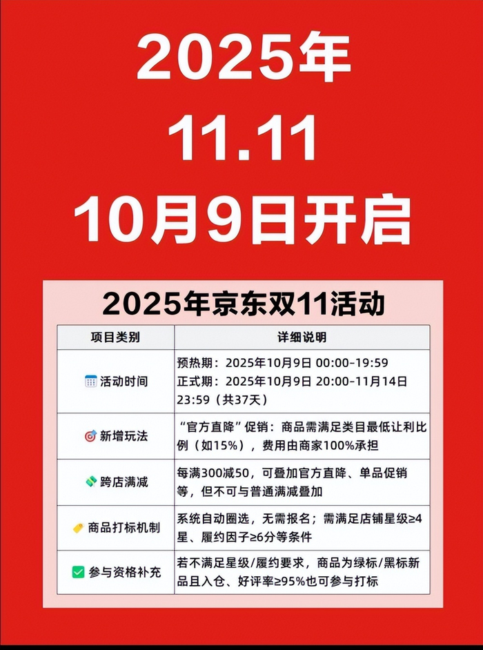 京东平台的双十一活动周期为10月9日20:00-11月13日23:59,分为五个阶段: