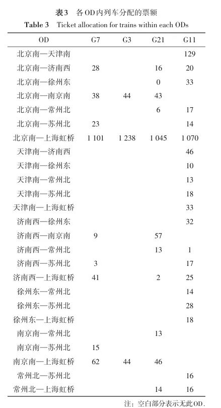 每个OD分配的票数并不相同。一项针对北京南到上海虹桥方向的G7、G3、G21及G11四趟列车的研究统计数据可见,始发站到终点站的全程票有1000多张,而北京南到天津南、北京南到济南西、济南西到南京南等OD,只有零星的几十张票[3]。