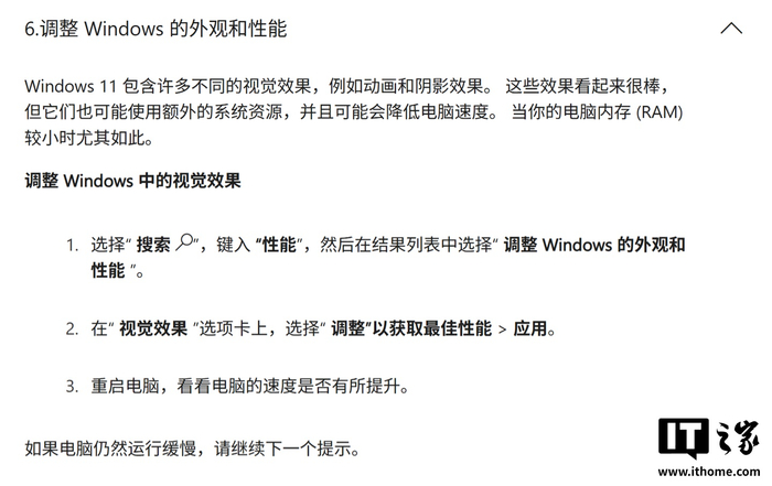 幸运的是,用户可以轻松关闭这些不必要的视觉效果。微软给出的操作步骤是:在 Windows 的搜索栏中输入“性能”,选择并打开“调整 Windows 的外观和性能”选项。