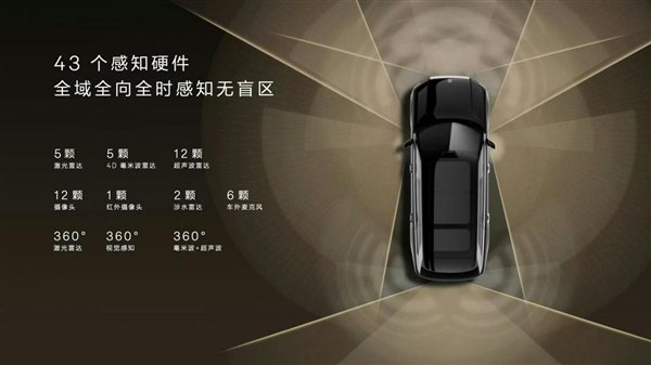 配合5个4D毫米波雷达、12超声波雷达、13高清摄像头、2涉水雷达、6车外麦克风,共43个感知单元,构建三重360°无死角感知矩阵,可以做到高速和城市快速路的L3级智能驾驶,并且为城区以及车位到车位的L3智驾做好准备。