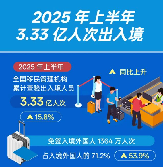 根据国家移民管理局公布的数据,2025年上半年,有1364万人次外国人是免签入境的,占所有入境外国人比例高达71.2%。
