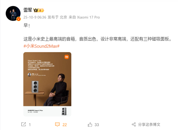 国庆后上班第一天:雷军推荐小米史上最高端音箱!