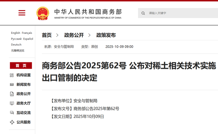 10月9日,商务部发布2025年第61号公告,公布对境外相关稀土物项实施出口管制的决定;发布2025年第62号公告,公布对稀土相关技术实施出口管制的决定。