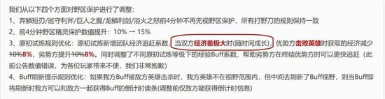 据了解,《王者荣耀》的“经济追赶机制”和上述实锤的20%金币暗改有些不同。根据王者荣耀官网此前公示的信息,S29赛季新增“经济追赶机制”,双方经济差极大时,优势方击败英雄获取的经济降低了8%,而劣势方击败英雄获取的经济提升了8%。这一机制只限定在击杀敌方英雄获得赏金的情况,而不包含击杀野怪和小兵这一情况。