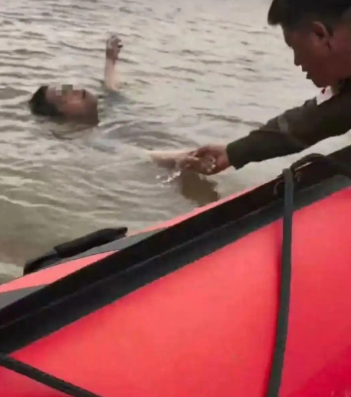 情况紧急,几名队员迅速展开救援行动。在落水者持续的挣扎与呼救声中,他们齐心协力,终于将男子拉上了冲锋舟。