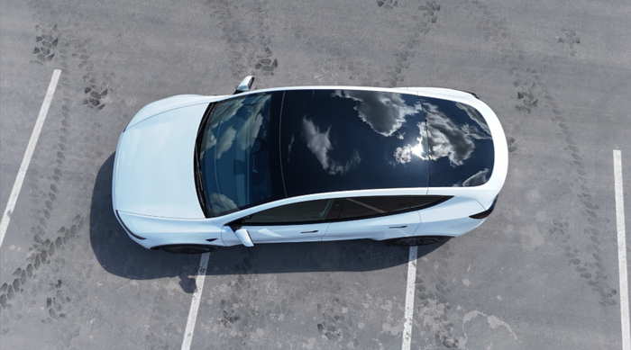 但事实是,丐版 Y 的车顶材质依旧是玻璃的。之所以车里看着没有天幕,是因为特斯拉在生产的时候直接在玻璃车顶下面加了个织物顶棚。