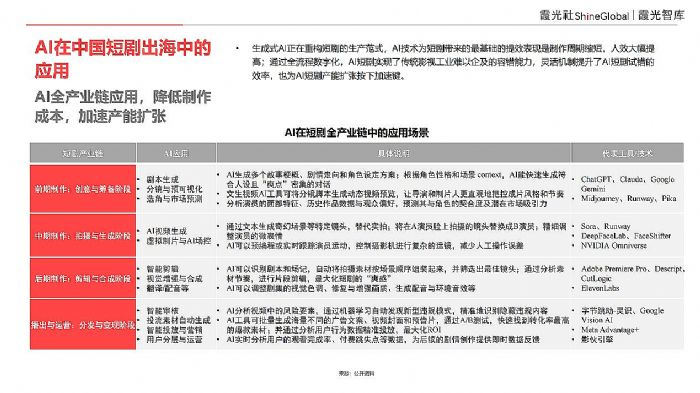 《报告》单独诠释了 AI 在中国短剧出海中的应用:目前 AI 已深度参与短剧出海各关键环节,成为降本增效的核心动能。在制作端,从AI生成剧本与分镜,到虚拟制片与智能剪辑,大幅压缩了创意到成片的时间;在运营端,AI可以智能生成海量营销素材进行A/B测试,实现精准投放,同时通过用户数据分析,进一步反哺创作,完成内容持续优化。
