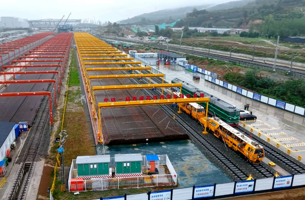 该工程桥隧比高达94%,地质条件复杂,施工难度大。为应对地形复杂、交叉作业多、安全风险高等挑战,项目采用我国自主研发的新型铺轨设备和智能化管理系统,包括智能群吊与轨道工程运输管理智控平台,实现铺轨作业的数字化与精准化管理,有力提升施工效率与安全控制水平。